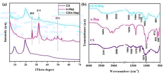 (a) XRD patterns, and (b) FT-IR spectra of CS, n-Hap, and CS/n-Hap.