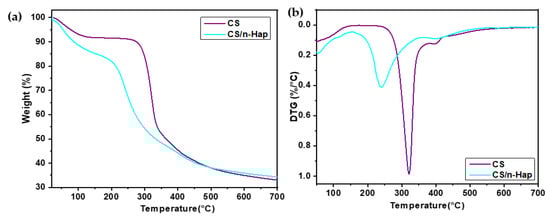 Three main stages of weight loss were observed for both CS and CS/n-Hap samples (Figure 2a,b). The first stage in the range 50–100 °C was attributed to the dehydration of physically retained water, which starts at relative low temperature [,]. The thermal decomposition and degradation of the main chain and deacetylation of the CS molecules was responsible for the dominating weight loss at around 228–400 °C in the case of CS []. For the CS/n-Hap bio-composite, this weight loss stage occurred at lower temperatures than for CS. This may be due to the improved heat transfer to the CS matrix by the inorganic n-Hap particles present on the surface, leading to rapid degradation of the organic CS []. Both CS and CS/n-Hap exhibited other weight loss stage in the range 330–500 °C owing to decomposition of the degraded fragments and slow char oxidation []. Finally, residual weight loss at temperatures above 600 °C may be related to the n-Hap dehydroxylation during its thermal decomposition [].