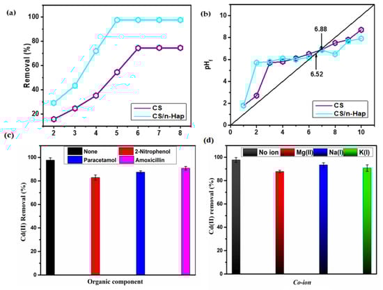 (a) Effect of pH on Cd(II) removal, (b) point of charge zero (pHPZC) plot, (c) effect of organic compounds, and (d) effect of counter ions on Cd(II) removal onto CS/n-Hap (t: 120 min; m: 2.0 g/L; C0: 100 mg/L; T: 25 °C, and counter ions/organic Co: 50 mg/L).