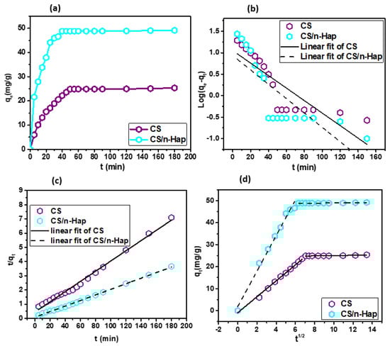 Modeling of kinetic data was done to understand the adsorption dynamics and determine the kinetic rate constant. The pseudo-first order, pseudo-second order, and intra-particle diffusion kinetic models given by equations displayed in Table S1 (Supplementary Materials) were tested to describe the adsorption of Cd(II) onto CS and CS/n-Hap. The linear fittings of the models are illustrated in Figure 4b,c and the kinetic parameters are displayed in Table 1.
