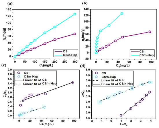 The equilibrium concentration of Cd(II) (Ce) after adsorption onto CS or CS/n-Hap and the corresponding adsorption equilibrium isotherms are plotted in Figure 5b. Both isotherms were positive, regular, and showed an increase in the qe with increasing equilibrium Cd(II) concentration (Ce), not showing an apparent saturation under the studied experimental conditions, which indicates that there was no formation of a complete monolayer of Cd(II) over the surface of the adsorbents [].