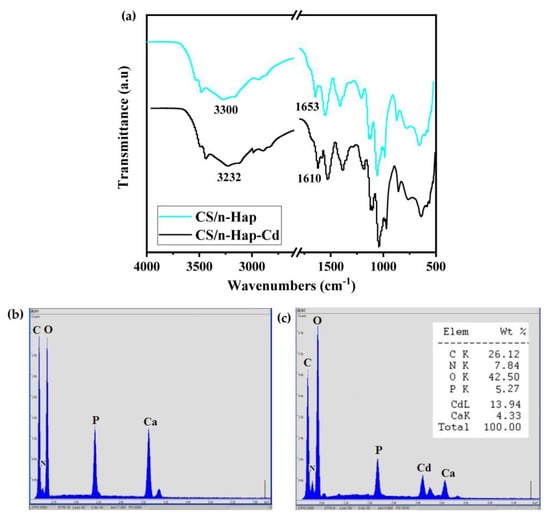 (a) FT-IR spectra, EDX of CS/n-Hap, (b) before adsorption, and (c) after Cd(II) adsorption.