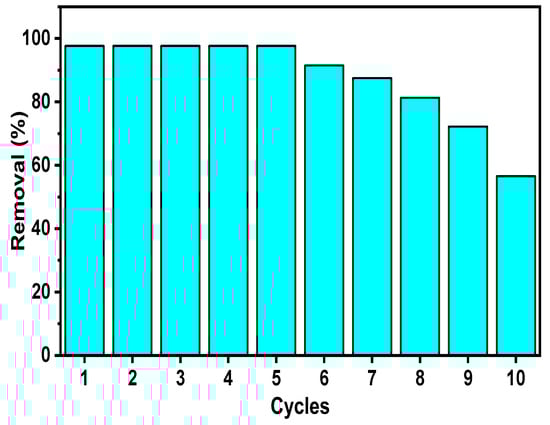 The possibility of an adsorbent being easily regenerated and stable through regeneration allows for its reutilization, which is highly valued from an economic point of view. In order to find if this was the case of the CS/n-Hap composite, it was subjected to successive adsorption/desorption cycles. As illustrated in Figure 7, the removal percentage of Cd(II) by CS/n-Hap was initially 97.65%, which still maintained after five regeneration cycles, testifying the great stability and excellent regeneration ability of the here synthesized CS/n-Hap composite. After the fifth regeneration cycle, the adsorption performance of CS/n-Hap progressively decreased, reaching 56.5% after ten successive regeneration cycles due to the decline in active adsorption sites after repeated regeneration cycles []. Nevertheless, even after five regeneration cycles, CS/n-Hap was able to adsorb Cd(II). Hence, it was evidenced that this bio-composite can serve as an economical adsorbent for an efficient removal of Cd(II) from contaminated water.