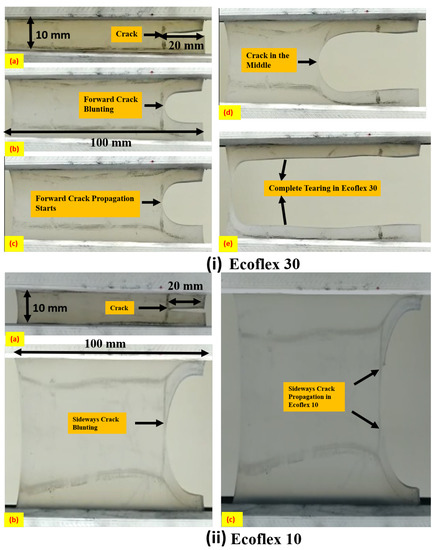 - Ecoflex 30 and 50 show forward crack propagation, while Ecoflex 10 exhibits sideways crack propagation that prevents complete fracture under multiaxial deformation. This property is particularly beneficial in span morphing, where the sideways crack propagation prevents complete failure of the skin.