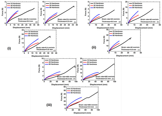 3.1. Effect of Shore Hardness on the Force Versus Displacement Curves and Stretchability at a Fixed Strain Rate