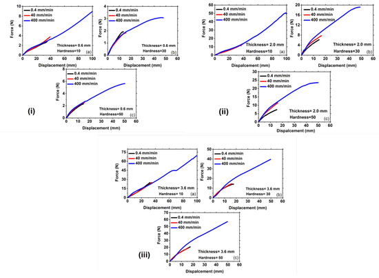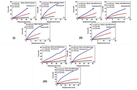 3.2. Effect of Thicknesses on the Force Versus Displacement Curves and Fracture Toughness for Different Shore Hardness at A Fixed Strain Rate