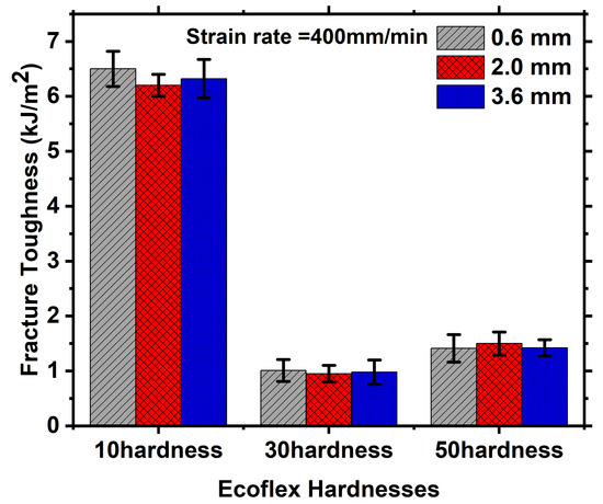- Actuation force and fracture toughness of Ecoflex 10, 30, and 50 increase with higher strain rates and Shore hardness, while remaining independent of thickness. At a strain rate of 0.4 mm/min, Ecoflex 10 displays fracture toughness of approximately 1.1 kJ/m for all thicknesses. As camber morphing occurs at higher strain rates, Ecoflex’s higher fracture toughness makes it suitable for use in camber morphing.