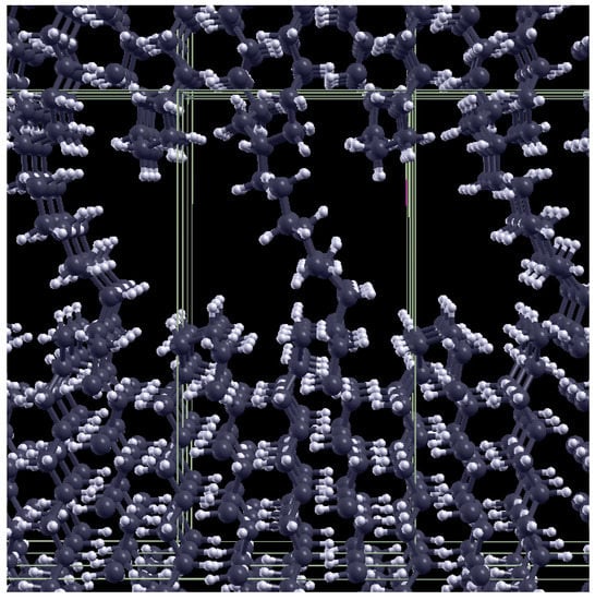 Our theoretical approach to the infrared spectrum of polyethylene containing carbonyl defects is based on density functional theory (DFT). Before describing the technical details of the theoretical framework, we discuss the model used for polyethylene in order to represent both the crystalline and the amorphous regions, as well as their interface. We relied on a slab supercell including a thin crystalline lamella separated by its periodic images, in the direction perpendicular to the lamella surface, by a region that is empty space except for a single chain connecting the two lamella surfaces. This model, containing 150 atoms, is a variant of the model described in detail in []; the modification consists of the connecting chain, which was branched on each surface by removing a hydrogen atom. A view of this model can be seen in Figure 1. The model was fully relaxed by keeping fixed the in-plane lattice parameter of the orthorhombic crystal and, for the out-of-plane lattice parameter, we kept the value used in []. We note that this gives an overall density (0.88 g/cm) that is close to typical experimental values for LLDPE.