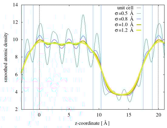 Planar average atomic density along the z direction (perpendicular to lamella surfaces) for the model shown in Figure 1. The various curves have been obtained by making different choices for the width for the Gaussian function representing each atom. The region considered ”surface” in the following is delimited by blue vertical lines. Dotted lines are the boundaries of the periodic cell.