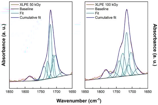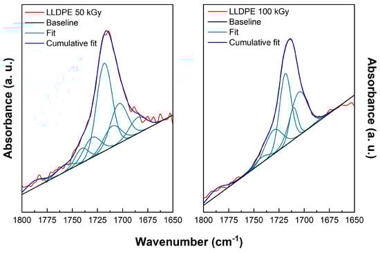 Deconvolutions were carried out for both materials, but only at the two higher doses listed in Table 1, as the carbonyl signal at 12 and 24 kGy was too weak to obtain reliable results. The baseline to be removed was determined in the area 1650–1800 cm. The fitting function used is a combination of Gaussian functions; this choice corresponds to the assumption that linewidths stem essentially from disorder, i.e., that new bonds are formed mainly in the amorphous phase.