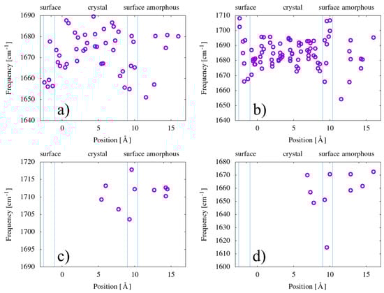 Calculated frequencies of the carbonyl group for (a) ketones, (b) esters, (c) carboxylic acids, and (d) enones, presented as a function of the position in the simulation cell in the direction perpendicular to the lamellae. Vertical blue lines delimit regions identified as amorphous, crystalline, and surface, as shown on top of the graph.