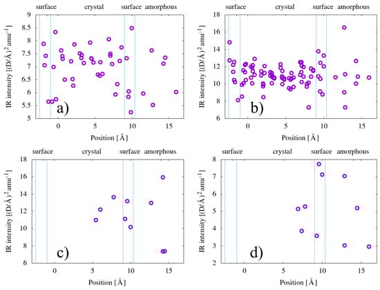 Calculated infrared activities of the carbonyl group for (a) ketones, (b) esters, (c) carboxylic acids, and (d) enones, presented as a function of the position in the simulation cell in the direction perpendicular to the lamellae. Vertical blue lines delimit regions identified as amorphous, crystalline, and surface, as shown on top of the graph.