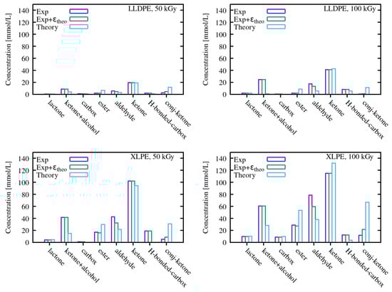 The obtained concentrations are shown in Figure 7. Here we compare three sets of concentrations, the first of which was obtained uniquely from experimental estimations of peak heights and extinction coefficients; the second of which resulted from a combination of experimental peak heights and theoretical IR activities/; and the third of which was obtained using peak heights from a deconvolution based on theoretical frequencies, combined with theoretical IR activities (except for lactones and H-bonded carboxylic acids, which were not in our calculated set). We note that the main outcomes were qualitatively similar for the three sets of concentrations: ketones were the dominant carbonyl type for both material types and doses, as expected from several previous results on similar materials [,,,]. Second, the build up of carbonyl species was significantly larger for XLPE than for LLDPE. Third, other species whose concentration is non-negligible were esters, aldehydes, lactones, and conjugated ketones.