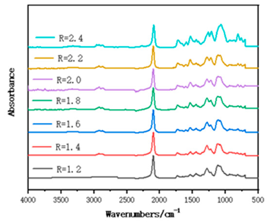 When the R = 1.0, the polymer film was not fully cured at 60 °C for 10 days; when the R = 2.6, although the sample could be cured at 60 °C for 1 day, the surface of the polymer film was uneven after curing because the sample was more sensitive to water. As a result, two samples with R = 1.0 and 2.6 could not be tested. Therefore, they will not be further discussed in the remainder of this text.