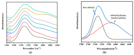 (a) FT-IR spectrum of carbonyl group of polymer films with different R; (b) FT-IR peak fitting spectrum of carbonyl group of polymer films.