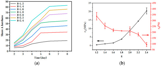 (a) Shore A hardness of the polymer films with different R; (b) curves of tensile strength and elongation at break of polymer films with different R.