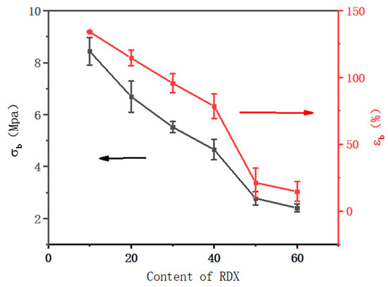 The mechanical properties of energetic polymer composites with different RDX particle contents were tested. The mechanical tensile and elongation at the breaks of polymer composites are shown in Figure 6. When the content of RDX particles is increased from 10 wt.% to 60 wt.%, the mechanical strength of polymer composites decreased from 8.44 MPa to 2.41 MPa, and the elongation at break decreased from 134.18% to 14.60%. This reason is attributed to two factors: one is that with the increases of RDX particle content, the content of polymer adhesive decreases; the other is that there is a poor interfacial binding force between polymer adhesive and RDX particles; these particles cannot constrain the movement of polymer chains, leading to a decrease in mechanical properties.