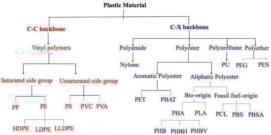 Plastic is a collective term used for multiple polymeric materials known to be lightweight, durable, and simultaneously able to produce bespoke shapes. A polymeric material is an extended repetition of the characterized monomeric unit synthesis from natural or chemical origins. Alongside having advanced materialistic properties, they provide an economical and real-time supply edge over alternatives such as glass, steel, and bio-based fibers. Naphtha and natural gas are the leading suppliers of plastic monomers, accounting for 6% of total annual crude oil production [1]. Numerous types of plastic are available on the market; however, their annual production is not uniform but skewed towards a few popular plastic types [2]. The top six popular plastic types, polyethylene (PE), polypropylene (PP), poly(vinyl chloride) (PVC), polystyrene (PS), poly(ethylene terephthalate) (PET), and polyurethane (PU), account for more than three-quarters of the total plastic production [3,4]. The overall layout of the polymerization process can yield a linear or branched polymer with a varying grade of crystallinity which dictates the usability profile of a polymer [5]. Plastics available in the market are not homogenous but contain additives, dyes, plasticizers, antioxidants, and antibiotics to achieve the tailor’s properties [6,7]. Based on the combination of atoms in the main backbone, plastic types can be divided into C-C or C-X groups where X is any heteroatom other than carbon [8,9]. Within the C-C group are the vinyl polymers, which are highly resistant to any form of degradation due to the inert nature of their backbone. The C-X class has multiple subtypes based on the nature of the bond between carbon and heteroatom, such as ether, amide, and ester. Figure 1 shows the hierarchical classification of plastic types with examples. The supplementary Table S1 contains all the names of plastic types and their abbreviations used throughout the manuscript.