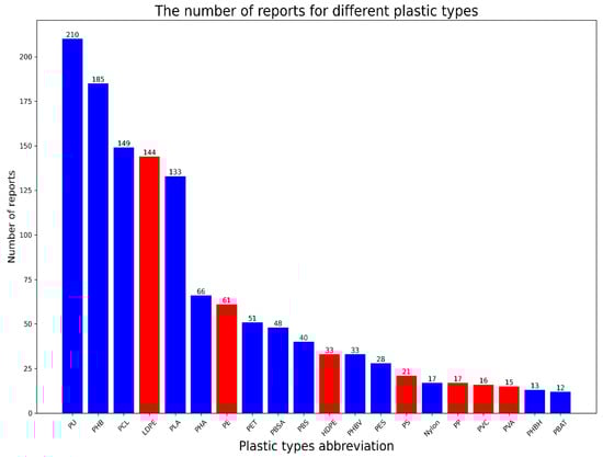 The frequency plot for different plastic types based on the number of publications reported for biodegradation of the corresponding plastics type.