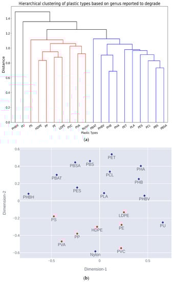 A matrix of 273 rows and 20 columns from 1292 initial records was designed, where the row represents a unique genus and the column represents a selected plastic type. The individual entries in the matrix were filled with one only if the corresponding row’s genus was reported to degrade the corresponding column’s plastic type; otherwise, 0 was assigned to that entry. The cosine distance was calculated between all column pairs, and values were stored as a 20 by 20 distance matrix. Hierarchical clustering and Multidimensional scaling (MDS) were performed using the precomputed cosine distance matrix. Figure 3 shows the hierarchical clustering and MDS of 20 selected plastic types. Within the analysis, the plastic types cluster into two more prominent groups based on their genus level biodegradation pattern. The hierarchical clustering mimics the molecular clustering of plastic types shown in Figure 1. The C-C group of plastic types PS, HDPE, PP, PE, LDPE, PVC, and PVA come together in a single group. Simultaneously, PBAT, PHBV, PHB, PHA, PET, PLA, PES, PCL, PBS, and PBSA of the C-X plastic types are in another group. Within the C-C group, the saturated side group of plastic types PE, PP, LDPE, and HDPE form a subcluster; however, PS, PVC, and PVA of the unsaturated side chain plastic type do not show assertive group behavior. There are fewer reports for PS, PVC, and PVA plastic types, and their association may become stronger with future findings. The PHBH and PU show out-of-group behavior, while Nylon is in an opposite C-C dominated group. PHBH has the lowest number of reports among aliphatic polyester; it could be the reason for outlier behavior. The aromatic polyesters PET and PBAT are in the same group, but do not show the highest similarity. Overall, we have observed that at the more comprehensive level the molecular architecture dictates the biological degradation pattern of the plastic.