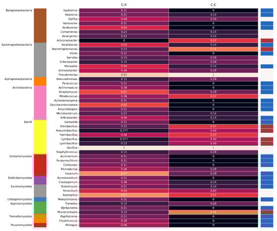We further selected 51 genera reported for four or more plastic types to explore the genus level preference for plastic degradation. The plastic types were converted into two groups of C-C and C-X, as described before. The proportion of group reporting was calculated based on the number of plastic types reported for that genus from that group. For example, two out of thirteen and two out of seven plastic types were reported for the Staphylococcus genus for C-X and C-C groups; they were assigned 0.15 and 0.29 group values, respectively. Figure 4 shows the group level proportion for all 51 selected genera. The row order in the heatmap was selected based on the leave order in the phylogenetic tree return from the NCBI tree browser [49]. Every row in the heatmap was assigned a color of red or blue for C-C or C-X, respectively, if the proportion of one group is twice the proportion of the other; otherwise, it is left blank. In front of the genus’s names, the class of the respective genus is mentioned to give a broader phylogenetic assignment of plastic biodegradation. We can see that C-X dominated genera are spread all over the tree; however, C-C are concentrated in the Bacilli class of microorganisms. In fungi, the Phanerochaete genus is only assigned to the C-C group, but the assignment does not continue to class level observation. Figure S4 shows the extended version of Figure 4 here; the individual groups are replaced with their corresponding plastic types. The proportion difference between the two groups is calculated to test whether the group level behavior among these 51 selected genera was statistically different. The Kolmogorov–Smirnov test showed the nonnormal distribution of the proportion difference between groups. The Wilcoxon signed-rank tests return a p-value of 0.0037, indicating a statistically significant difference between these two groups for these 51 genera. We did not find a statistically significant difference p-value of 0.29 when we calculated the difference for the actual number of reports.