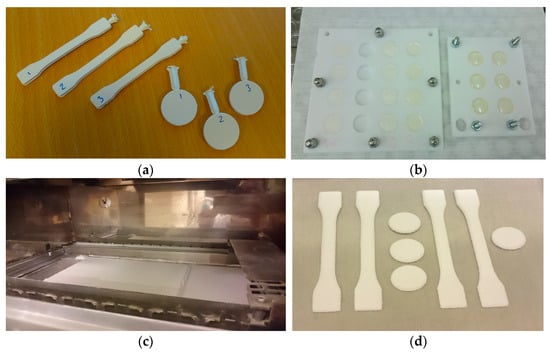 (a) Injection moulded specimens (IM_65BN3); (b) cast specimens in Teflon moulds; (c) PBF 3D printer; and (d) PBF specimens.