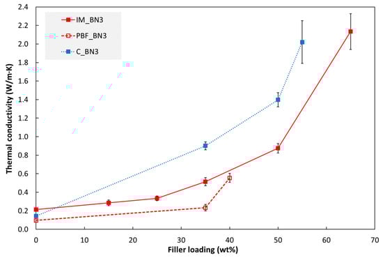 Thermal conductivity (at 30 °C) of composites fabricated by injection moulding (“IM”), powder bed fusion (“PBF”) and casting (“C”) as a function of hBN (BN3) loading. The PBF specimen with 40 wt% hBN was processed with a higher laser energy density than the other PBF specimens in this figure, see Figure 3 and Table S3 in the Supplementary Materials.