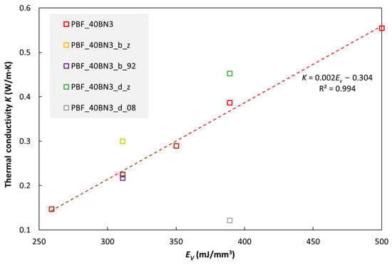 Thermal conductivity (at 30 ºC) of TPU with 40 wt% hBN (BN3) as a function of EV (laser energy density, see Equation (1)). For details about the specimens, see the main text and Table S3 in the Supplementary Materials.