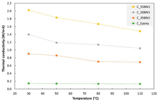 Figure 4 shows the thermal conductivity of cast hBN/epoxy composites as a function of the temperature. For all hBN fractions in the figure (0 to 55 wt%), the thermal conductivity decreases approximately linearly with increasing temperature. For pure epoxy, the conductivity drops by about 9% when increasing the temperature from 30 °C to 110 °C. For composites with 35–55 wt% hBN, the corresponding drop is about 25% (the differences between the three hBN fractions were not statistically significant). Similar temperature effects were observed for IM and PBF composites.