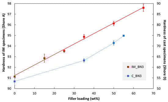 The hardness values of injection moulded and cast specimens are presented in Figure 5. In both cases, the hardness increases with increasing hBN content (note that two different Shore scales are used in the figure).