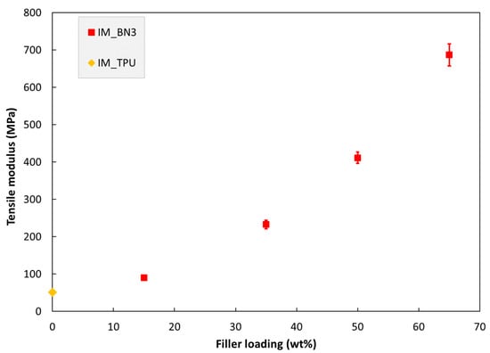 Tensile modulus of injection moulded specimens as a function of hBN loading. The specimen IM_TPU is 100% TPU.