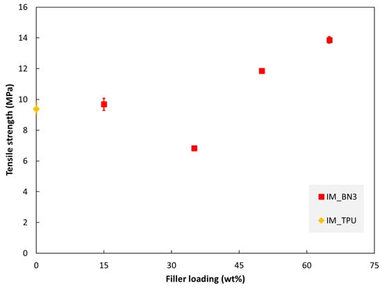 Tensile strength of injection moulded specimens as a function of hBN loading.