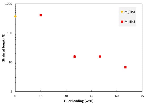 Regarding tensile strength and strain at break vs. hBN fraction (Figure 7 and Figure 8), the trends above 15% hBN could be explained by two mechanisms which occur when adding fillers. Increasing the hBN content reduces the ductility, i.e., reduces the strain at break. However, increasing the hBN content also reinforces the material, i.e., shifts the stress–strain curve upwards (to a higher stress for a given strain). From 15 to 35% hBN, the first mechanism dominates both the strength and strain at break, while from 35 to 50%, the second mechanism dominates.