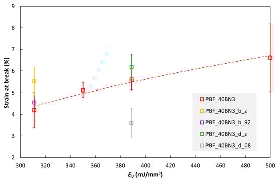 Strain at break of PBF specimens with 40 wt% hBN (BN3) as a function of volumetric energy density EV. The specimen codes are explained in Table S3 in the Supplementary Materials.