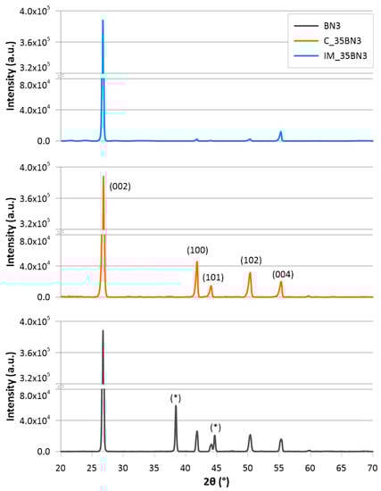 XRD patterns of pure BN (BN3) and specimens with 35 wt% BN3 fabricated by injection moulding (IM_35BN3) and casting (C_35BN3). The diffractogram of the pure hBN has peaks originating from the sample holder (marked with *) due to the small hBN sample size.