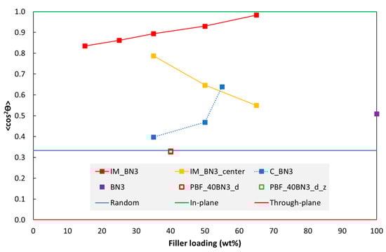 Orientation of hBN platelets ( from Equation (3)) as a function of hBN loading in discs fabricated by injection moulding (IM_BN3), casting (C_BN3) and PBF (PBF_40BN3_d; PBF_40BN3_d_z). Data from the centre of an IM specimen (after grinding and polishing away half the thickness) are also included (IM_BN3_centre). The solid lines correspond to through-plane, random and in-plane orientations. The data points of the two PBF specimens overlap (open square symbols).
