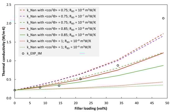 According to experimental literature on composites with hBN, the percolation threshold for thermal conductivity is about 20–25 vol% for randomly oriented platelets (studies with hBN size in the range of 3–8 µm [], average particle size of 5 µm [] and no size given []). For highly through-plane-orientated platelets, the threshold is reported to be about 10–15 vol% (studies with average particle sizes of 25 µm [], 8 µm [] and 5 µm []). Hence, the thermal percolation threshold depends on the orientation of the hBN platelets in the polymer matrix. Above the percolation threshold, the platelets form thermally conductive pathways in the polymer matrix. We will return to a discussion of conductivity vs. hBN fraction in the next section, when comparing experimental data with model predictions.