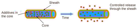 In both methods, the solvent evaporates from the fibers on its way to the collector, thus producing solid fibers with a core–shell structure (see Figure 3a). Initially, only water was used inside the fiber with different synthetic polymers dissolved in appropriate solvents for the shell.