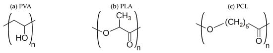 Chemical structure of polymers: (a) PVA, (b) PLA, and (c) PCL.
