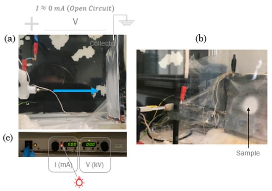 Coaxial electrospinning assembly (a), sample visualization (b), and high voltage source, where intensity (I) in mA and voltage (V) in kV are displayed (c).