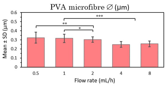 Mean and standard deviation of the diameters of 21% PVA microfibers manufactured at 15 cm, 15 kV, and 0.5, 1, 2, 4, and 8 mL/h., at (*) p < 0.05, (**) p < 0.01, (***) p < 0.001 statistically significant differences.
