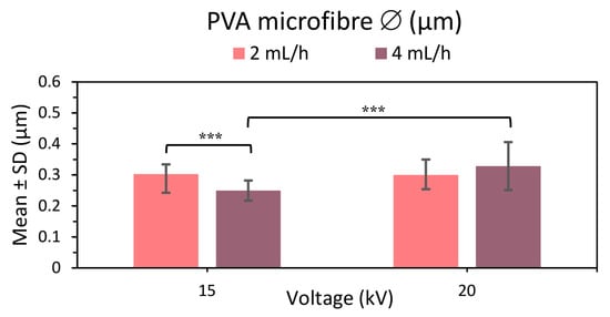 Mean and standard deviation of the diameters of 21% PVA microfibers manufactured at 2 and 4 mL/h and applying 15 and 20 kV, at (***) p < 0.001 statistically significant difference.