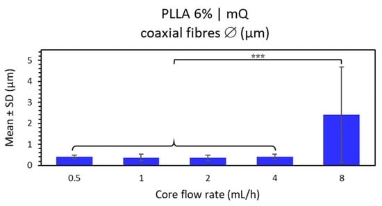 Mean and standard deviation of the diameters of PLLA 6% chloroform:DMF 80:20 (shell) and water mQ (core) coaxial microfibers manufactured at internal flow of 0.5, 1, 2, 4 and 8 mL/h, external flow of 4 mL/h, with 15 cm and 15 kV, at (***) p < 0.001 statistically significant difference.