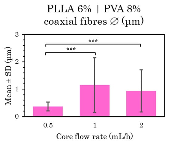Mean and standard deviation of the diameters of 6% PLLA (shell) and 8% PVA (core) coaxial microfibers manufactured at 0.5, 1 and 2 mL/h, with 15 cm and 15 kV, at (***) p < 0.001 statistically significant difference.