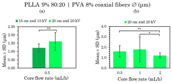 Mean and standard deviation of the diameters of 9% PLLA 80:20 (shell) and 8% PVA (core) coaxial microfibers manufactured at 0.5 mL/h with 20 cm and 20 kV compared with 15 cm and 15 kV (a), and at 0.5, 1 and 2 mL/h with 20 cm and 20 kV (b). Shell flow rate 4 mL/h in both cases, at (*) p < 0.05, (**) p < 0.01 statistically significant differences.