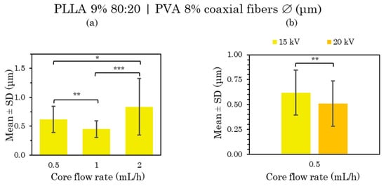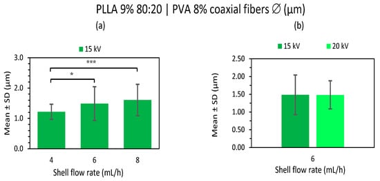 Mean and standard deviation of the diameters of 9% PLLA 80:20 (shell) and 8% PVA (core) 0.5 mL/h coaxial microfibers manufactured at 4, 6 and 8 mL/h shell flow rate with 15 cm and 15 kV (a), and at 6 mL/h shell flow rate with 15 kV compared with 20 kV (b). Core flow rate 0.5 mL/h in both cases, at (*) p < 0.05, (***) p < 0.001 statistically significant differences.