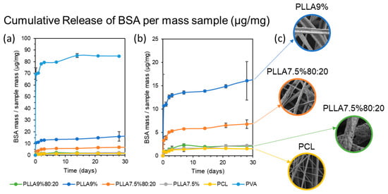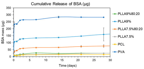 Second, in the release of the rest of the coaxial microfibers, i.e., those with a polymeric coating, samples PLLA9%80:20, PLLA7.6% and PCL released the least. The PCL sample is clear because it has no pores and has a homogeneous coating, which retains the BSA inside the fiber and means that the release is low and slow. The PCL sample is also expected to have a slower release, because it has a slower degradation time and so hardly degraded in the 30 days of the trial, so the release could be expected to be slow, since it only occurs by diffusion through the polymer matrix. Considering the PCL and PLLA degradation, the PCL has much longer degradation times due to their semi-crystalline nature, while the electrospun PLLA nanofibers were completely non-crystalline but had highly oriented chains and a lower glass transition temperature than the cast film []. The release results obtained suggest that it is the latter, i.e., that the pores that appear on the surface of the microfibers do not pass through the coating []. However, a more detailed analysis would be necessary to obtain a clearer conclusion. The results of this test disagree with those obtained by Tiwari et al. (2010), where PLLA-coated microfibers showed a relatively low release while the porous PCL showed a rapid burst release [].