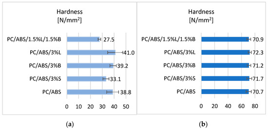 Analyzing the obtained results, it can be seen that the introduction of fillers in order to modify the properties of the PC/ABS polymer blend affected the obtained hardness values. In the case of hardness tests for fittings obtained with the rapid prototyping technology (Figure 5a), it was noticed that the PC/ABS/3%L composite obtained a 5.6% better result compared to PC/ABS. The lowest Rockwell hardness was obtained for the composite containing the hybrid filler 1.5%L/1.5%B (27.5 N/mm2). In the case of the results obtained for moldings produced by injection molding (Figure 5b), it was observed that all obtained composites are characterized by higher hardness compared to the unfilled polycarbonate/acrylonitrile-butadiene-styrene matrix.