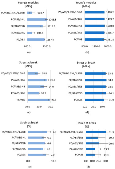Figure 6 presents the results of mechanical tests during the static tensile test for the polycarbonate/acrylonitrile-butadiene-styrene blend and PC/ABS composites. Analyzing the results obtained for the moldings produced with MEM technologies, it was found that the introduced fillers affect the Young’s modulus obtained during the static tensile test (Figure 6a). Only in the case of the PC/ABS/3%L composite was a better result obtained compared to the unfilled polymer blend, as the value of the tested feature improved by 5.8%. Other composites are characterized by a decrease in the modulus by as much as 21.4%. The lowest Young’s modulus values were obtained for PC/ABS composites with the addition of 3%S and 1.5%L/1.5%B. The obtained results are consistent with the hardness of the composites, because PC/ABS/3%L (41.0 N/mm2) is characterized by the highest values of the tested parameter, while those of PC/ABS/3%S (33.1 N/mm2) and PC/ABS /1.5%L/1.5%B (27.5 N/mm2) are the lowest. Moreover, when analyzing the Young’s modulus results obtained for moldings made by injection molding, it was observed that the introduced fillers did not significantly affect the stiffness of the blend (Figure 6b). The most rigid material turned out to be PC/ABS/3%B, for which a modulus value of 1500.0 MPa was obtained.