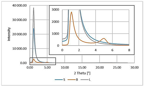 Analyzing the results obtained for the fillers (Figure 9), we can see a peak for B at a value of 5.0°, which can be attributed to the diffraction reflection from the bentonite (001) sheets [40]. Unfortunately, it was not possible to determine the characteristic peaks for the other modified fillers (S and L) due to the determination conditions used and the technical capabilities of the apparatus (range of scattering angles from 0° to 28°).